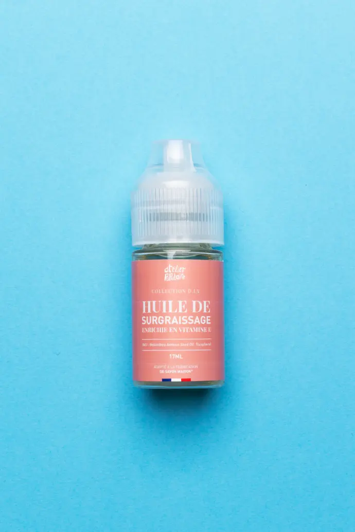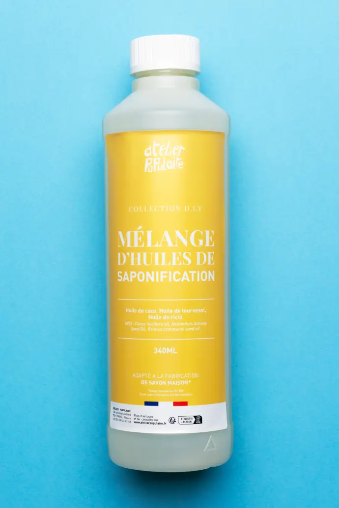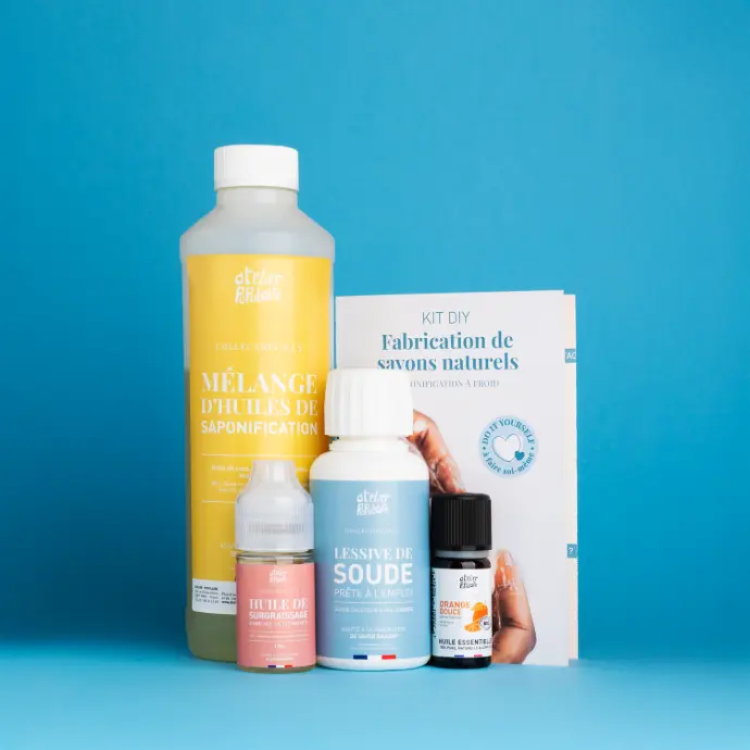 1 bouteille d'huiles de saponification, 1 bouteille d'huile de surgraissage et vitamine E, une bouteille de lessive de soude, un flacon d'huile essentielle au choix, le livret d'instruction et un moule en silicone (optionnel)